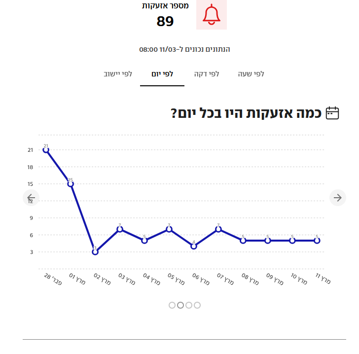Number of siren alarms per a day. Seems like we are getting into a normal situation of five siren alarms per day. But the timing is critical... (Source: ynet.com)Number of siren alarms per a day. Seems like we are getting into a normal situation of five siren alarms per day. But the timing is critical… (Source: ynet.com)