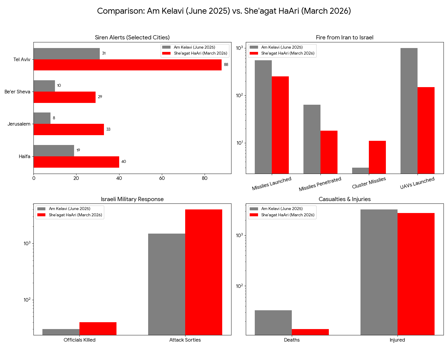 But the above does not include the rockets, missiles and drones from Lebanon. Hezbollah was not part of Am KeLavi war, while is a side in this war. Firing and bombing the settlements along the border with Israel daily, and every couple of day launch a missile to the center of Israel as well.